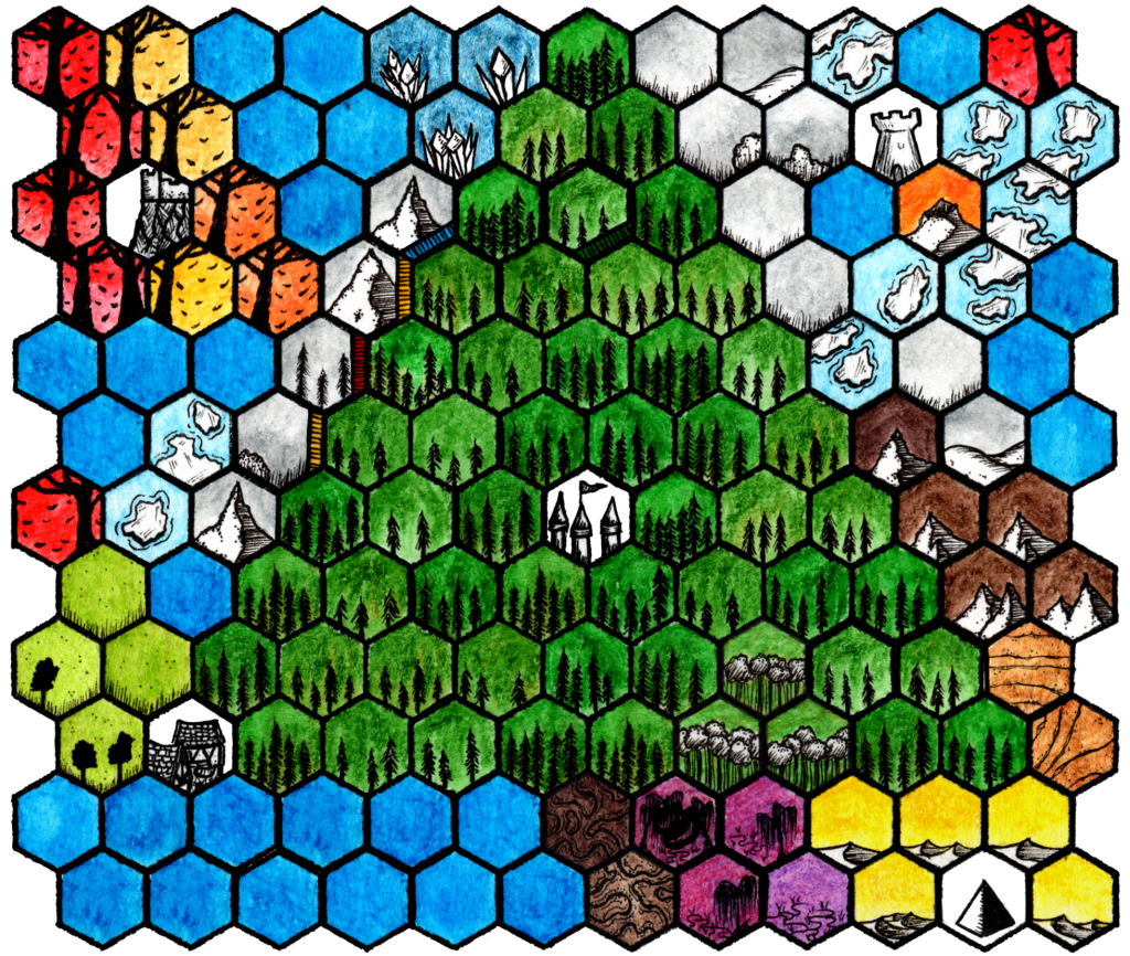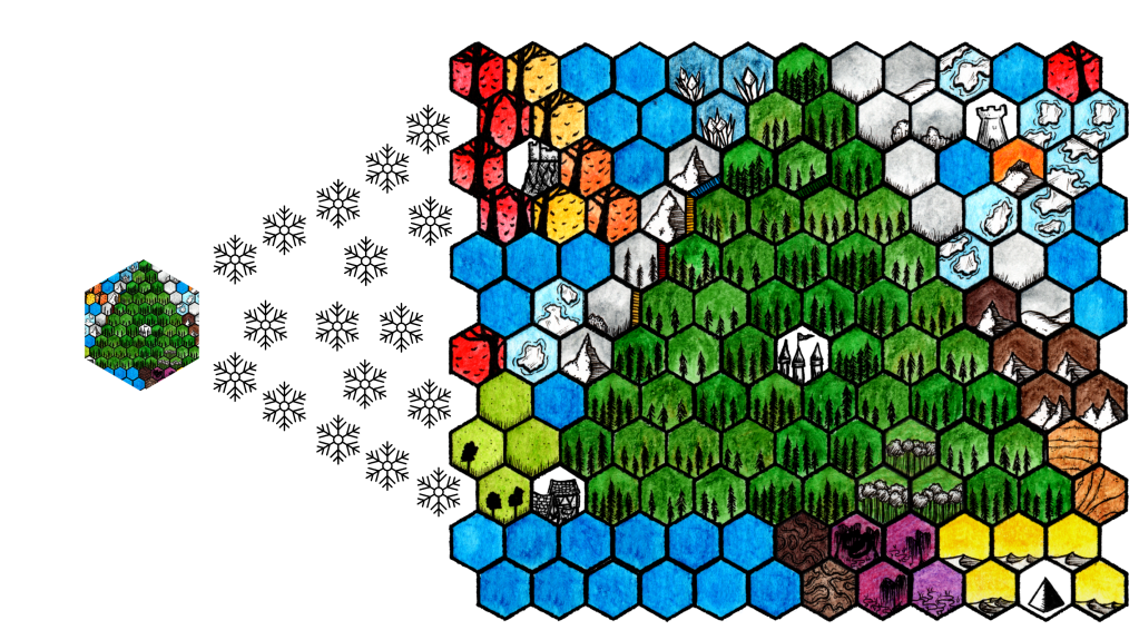 In my own desperate grab for attention, I’ve jumped on a blogwagon call from Prismatic Wasteland to create a bunch of Rankin-Bass-themed hexes that are supposed to somehow fit together on a map. Since mine is one of the the last entries, I’m going to handwave away fit into the larger map because “magic,” and then we’ll fix it in post.
