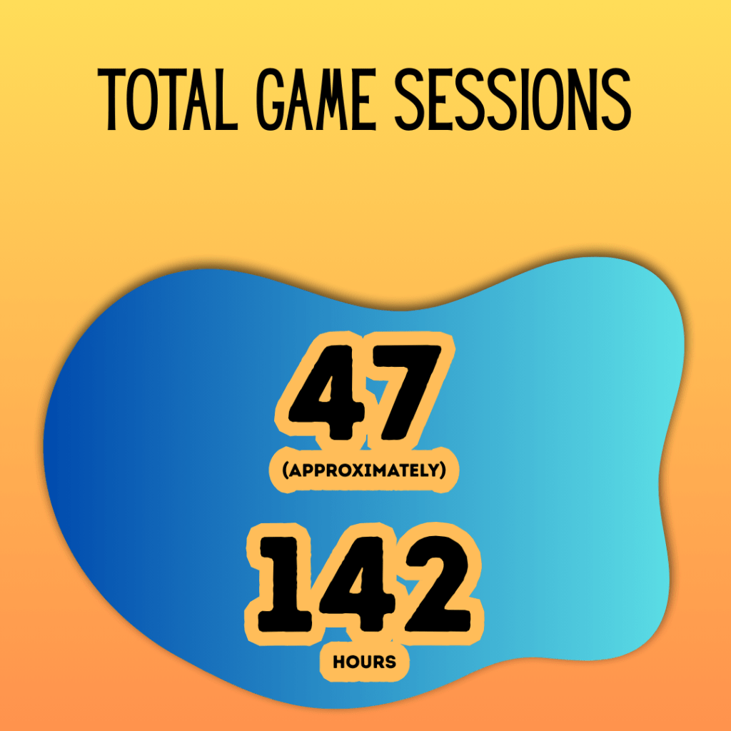 I’m assuming about 3 hours/session and some were only a couple of hourse, but likely forgetting a session or two, so we’ll call this accurate enough.